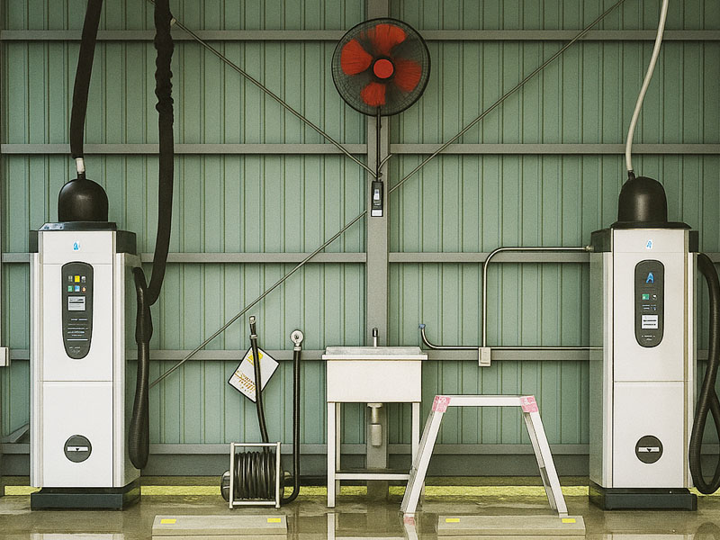高圧洗浄ブースでは、高圧洗浄機を使用し、通常の水圧では落ちにくい泥汚れや砂ぼこりを効果的に洗い流せます。